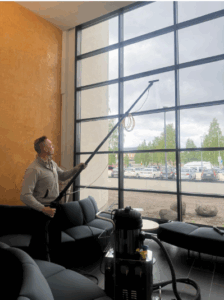 hiilikuituputkia. Putket yhdistetään imevään höyrypesuriin adapterin avulla. Ulottuvuutta saadaan noin 10m korkeuteen, kokenut pesijä pesee tarvittaessa myös korkeammalle. Höyryllä pestäessä pesuainetta ei tarvita, jolloin pesuainejäämiä ei jää ikkunan karmeihin/puitteisiin. Imu jättää pinnat kuiviksi.